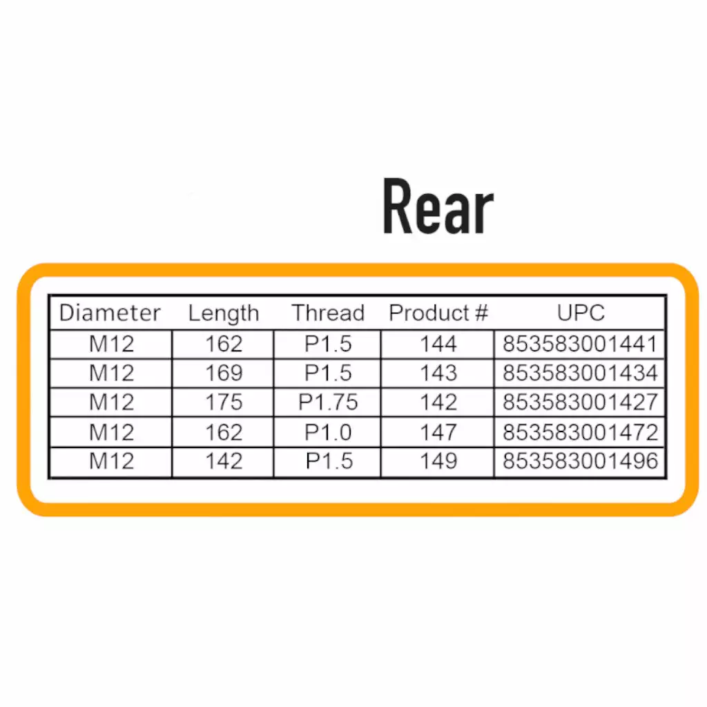 | Diamètre | Longueur | Filetage | 12 mm, 122 mm, 1.75 mm, 12 mm, 124 mm, 1.0 mm, 12 mm, 124 mm, 1.5 mm, 12 mm, 142 mm, 1.5 mm, 12 mm, 162 mm, 1.0 mm, 12 mm, 162 mm, 1.5 mm, 12 mm, 169 mm, 1.5 mm, 12 mm, 175 mm, 1.75 mm |