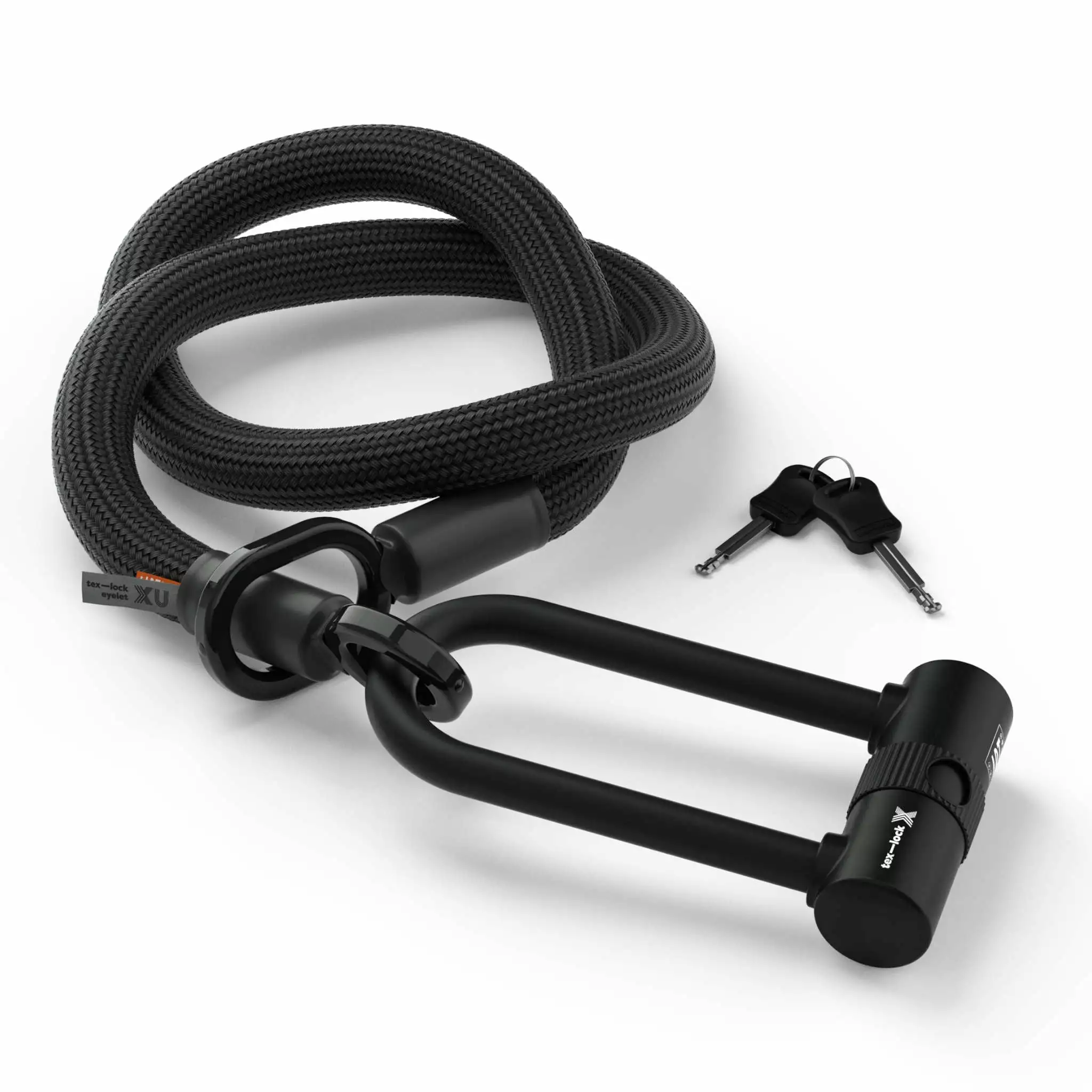 Tex-Lock propose également le X-Lock eyelet avec câble de 160 cm pour vélos cargo ou encore la version U-Lock avec câble de 120 cm + un mini U.