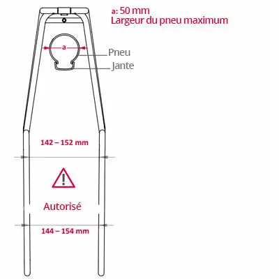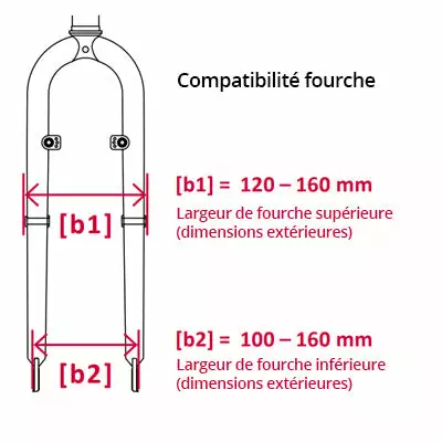 - Au niveau supérieur de la fourche : largeur externe entre 120 et 160 mm