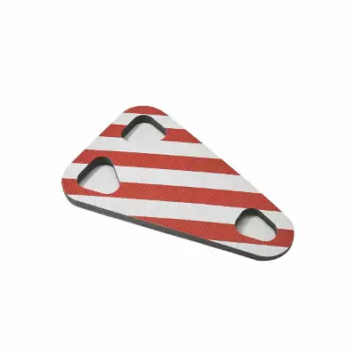En mousse PE à haute densité, le triangle de protection mesure l 38 x h 58 pour 15 mm d’épaisseur. En plus d’amortir les chocs, la surface dispose d’un revêtement de signalisation avec un imprimé de rayures blanches et rouges qui permet d’être visible par les véhicules derrière vous. Vous pouvez aussi ajouter une plaque de signalisation supplémentaire pour une meilleure visibilité.